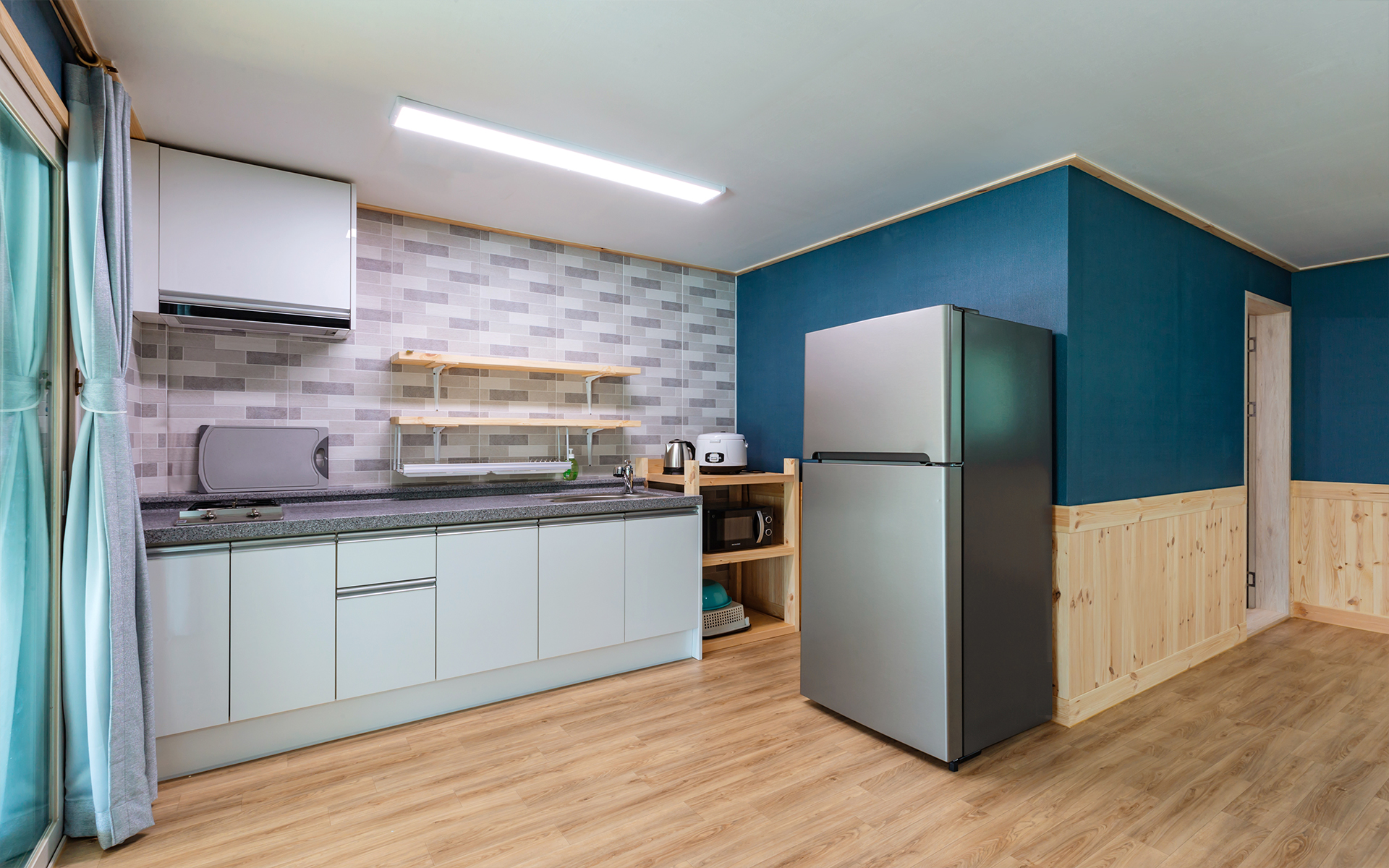 냉장고, 가스렌지, 밥솥, 전자렌지, 커피포트, 식기류일체